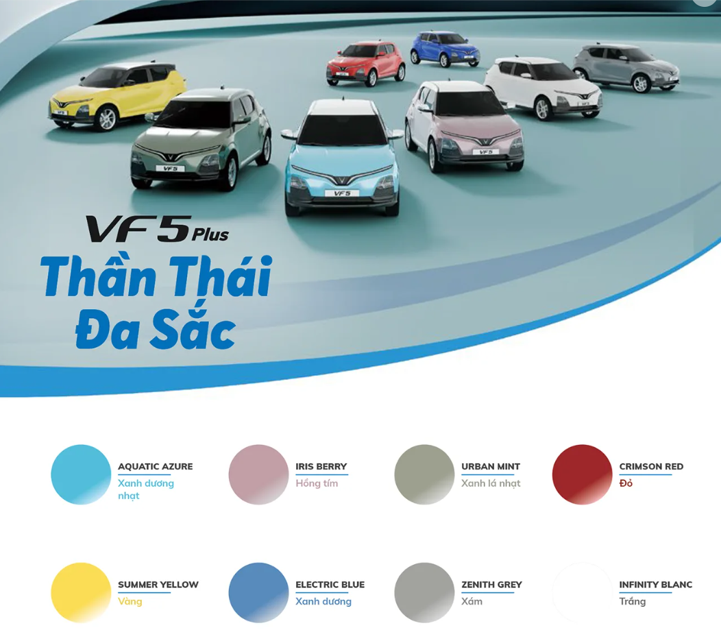 - 9 lựa chọn màu ngoại thất và 1 lựa chọn màu nội thất đen. Màu cơ bản: Trắng, Đỏ, 2 màu Xám, Xanh VinFast; Màu nâng cao: Vàng, Xanh dương nhạt, Xanh lá nhạt, Hồng Tím.