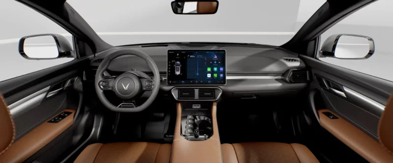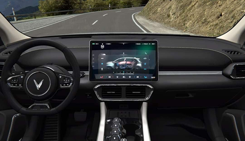 Điểm độc đáo của VF 8 phải kể đến không gian khoang lái với cụm vô lăng và bảng taplo hiện đại. Cụm đồng hồ thông tin lái được thay thế bằng màn hình HUD và tích hợp cùng với màn hình giải trí trung tâm kích thước 15,6 inch, đồng thời tối giản các nút bấm vật lý giúp người dùng dễ dàng theo dõi thông tinh hành trình và điều chỉnh các tính năng theo nhu cầu.